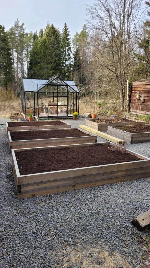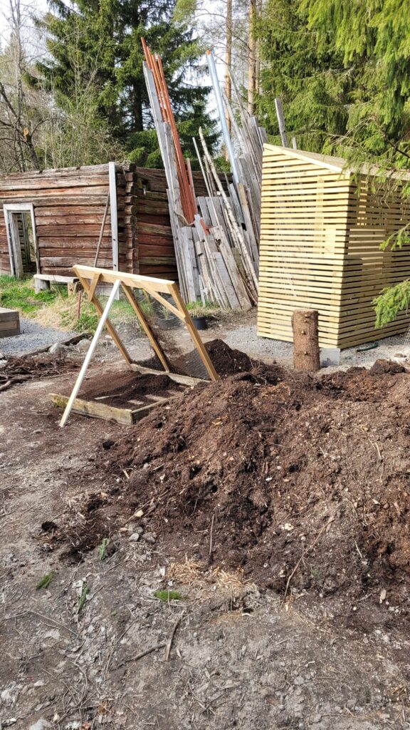 Na místě skleníku se nacházel původní kompost, který bylo možné odstranit až pozdě na jaře, protože byl na kámen zmrzlý. Po jeho romrznutí jsme nedostatečně zkompostovanou část přesunuli do nového kompostu, a zkompostovanou část překátrovali k použití v záhonech.