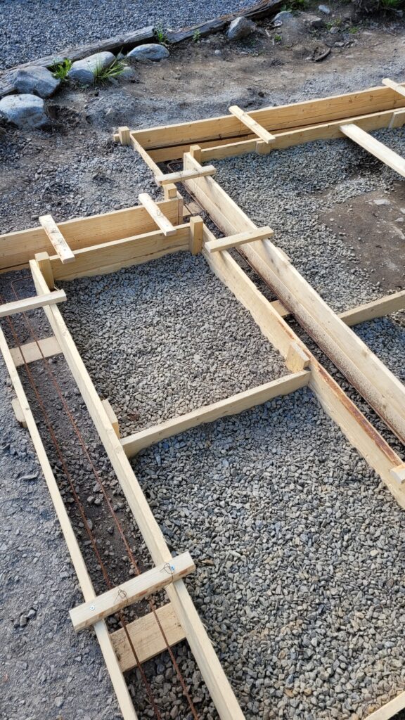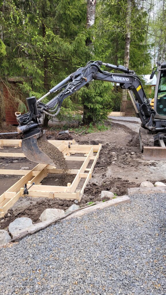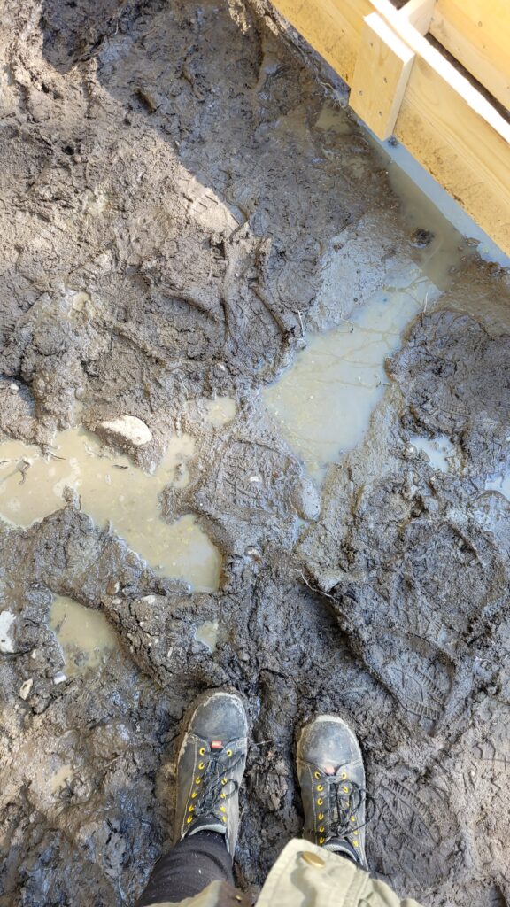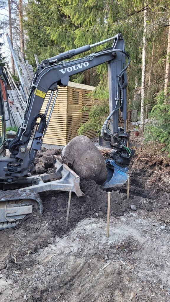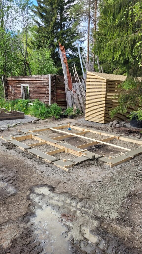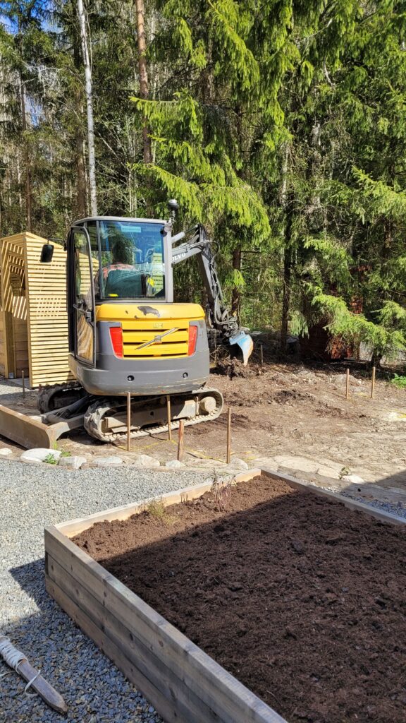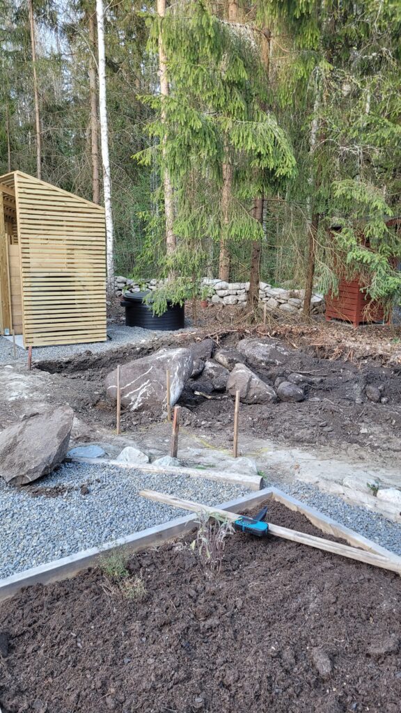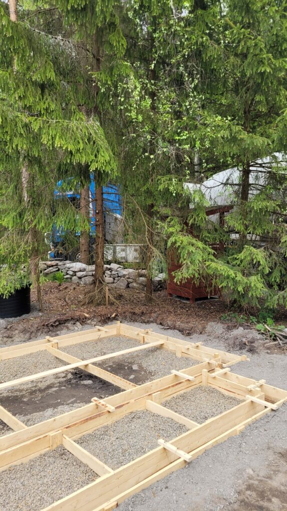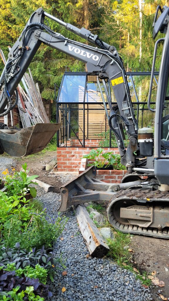 Pak přišlo na řadu vyměřování, bagrování a beton….. a ano, zase kameny.. Přesné umístění skleníku je tak dáno mimo jiné prostorem mezi kořeny stromů a nevykopatelnými kameny. A jak už to tak bývá… kdykoliv cokoliv kopeme, zaprší…