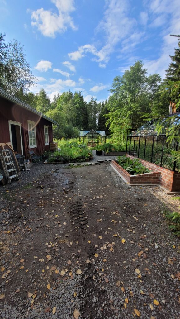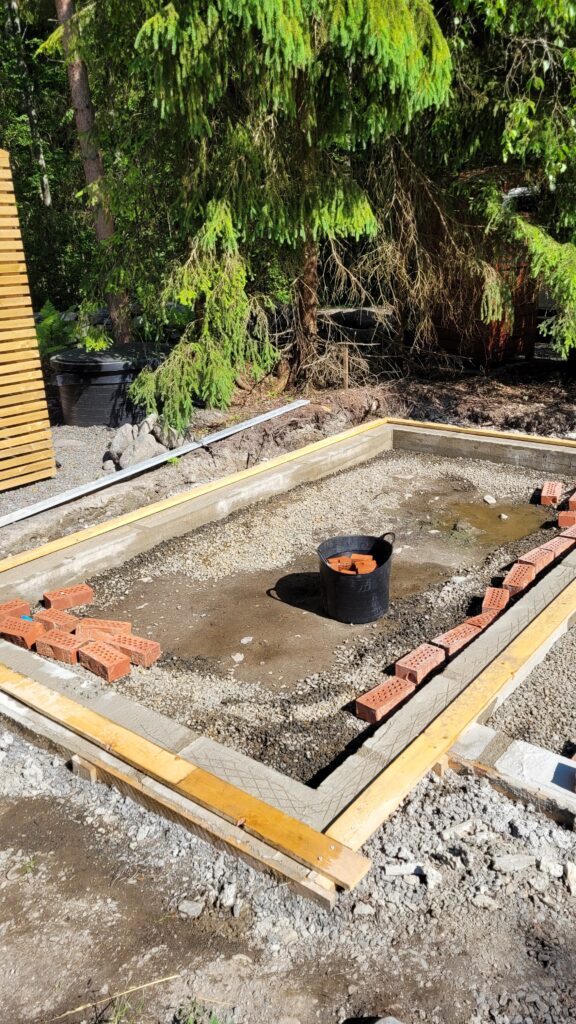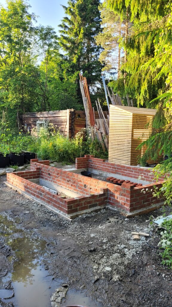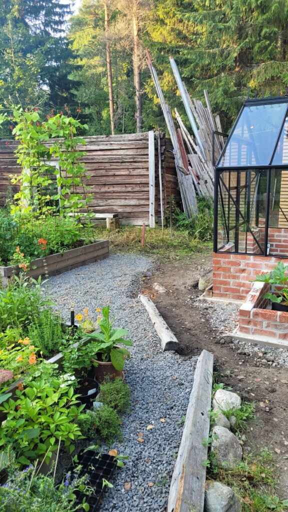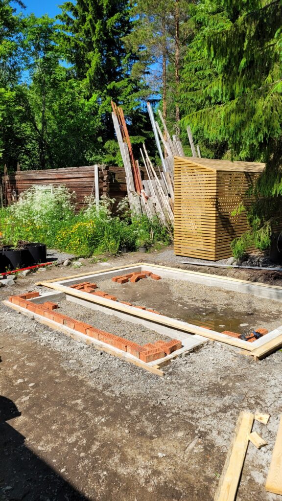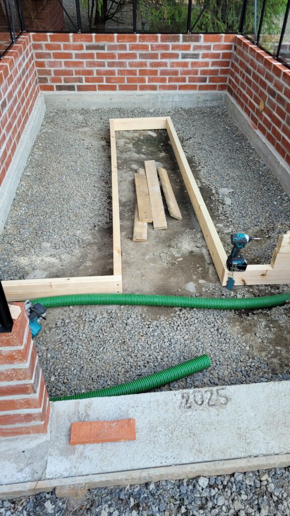 Dlážděná část podlahy bude vytápěná a v prostoru vedle dveří bude přivedená voda. Nic z toho jsme ale zatím dokončit nestihli, stejně jako víka na pařník. Zvládli jsme však přidat ještě poslední chybějící záhon.