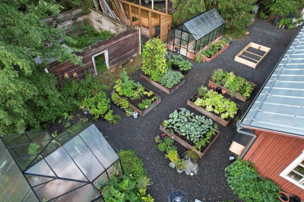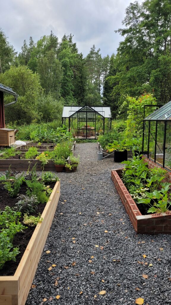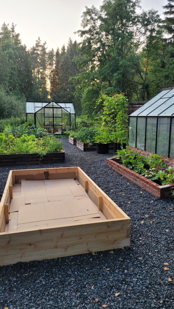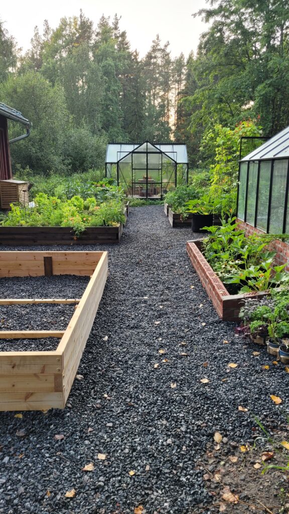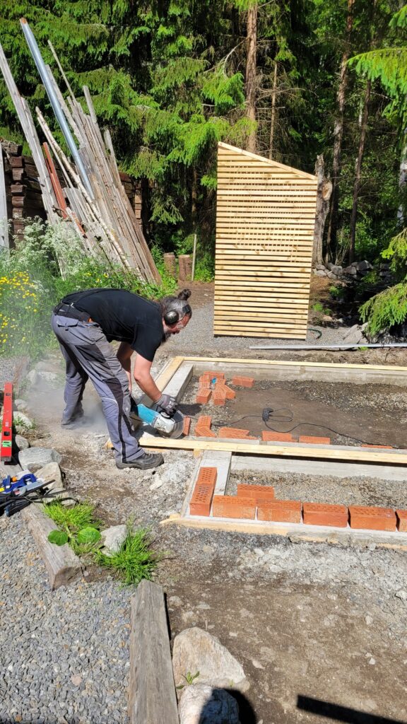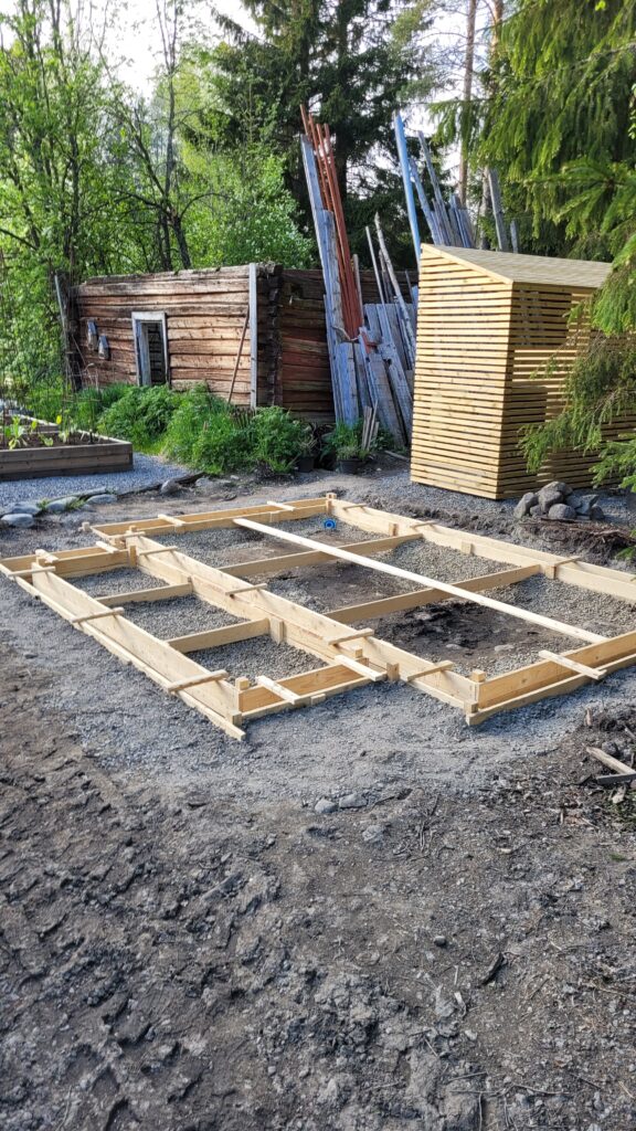 Dlážděná část podlahy bude vytápěná a v prostoru vedle dveří bude přivedená voda. Nic z toho jsme ale zatím dokončit nestihli, stejně jako víka na pařník. Zvládli jsme však přidat ještě poslední chybějící záhon.