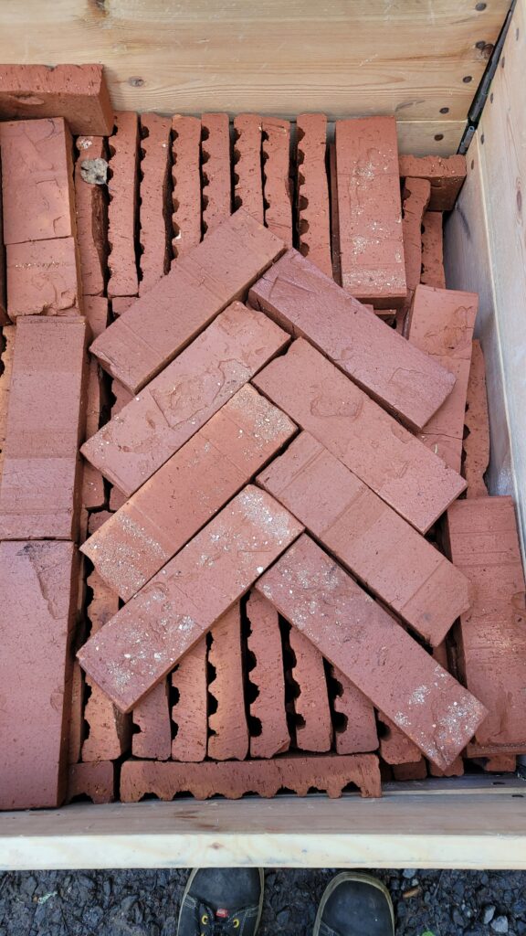 Cihly na podezdívku jsem vybírala dlouho. Nakonec jsem vybrala patinované od finského výrobce. Mají krásnou barvu a v tom samém odstínu prodávají i obklad, který je možné použít jako dlažbu, kterou plánujeme stejně jako v prvním skleníku. I s dopravou to celé vyšlo levněji než staré cihly přes inzerát, nebo lokálně sehnatelné moderní cihly. Ale bez problémů to neproběhlo…