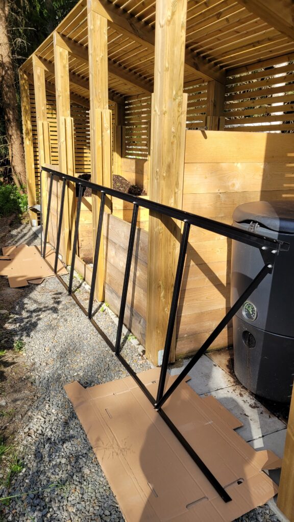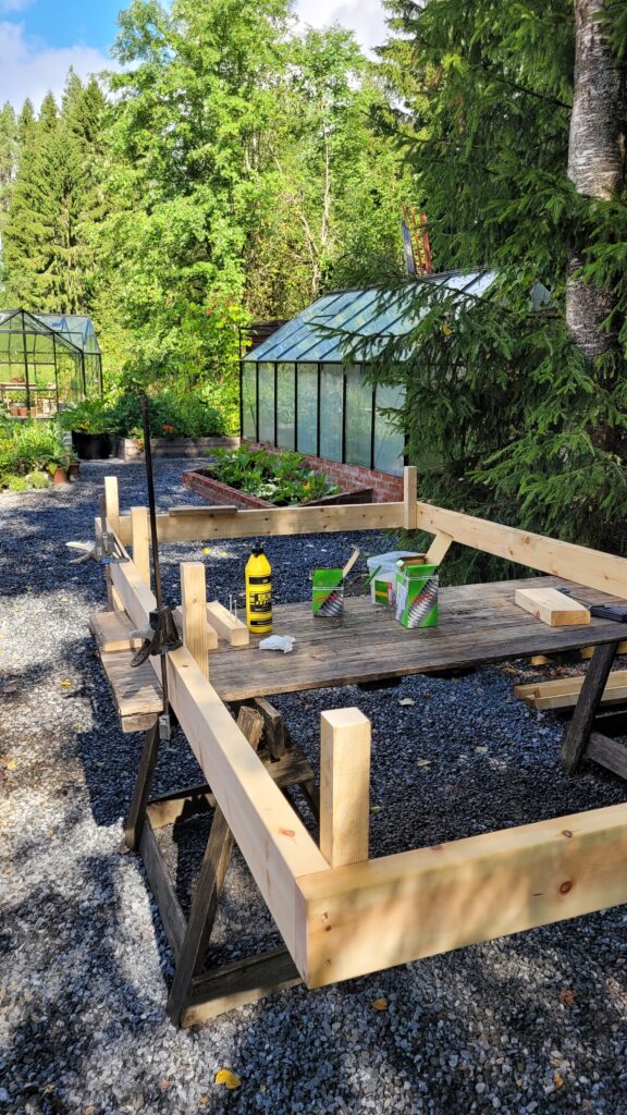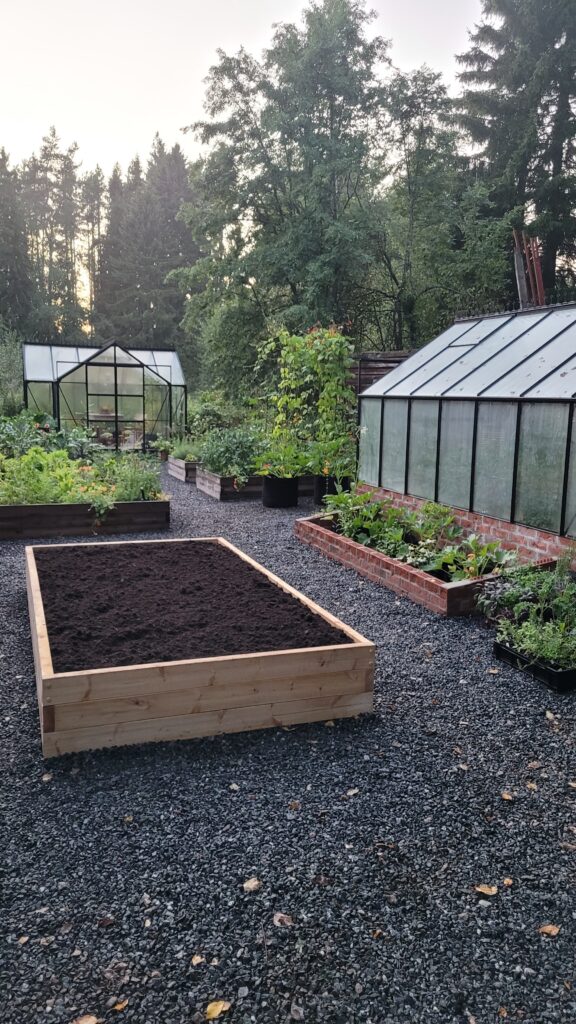 Totiž pařeniště…. postavili jsme si něco, čemu v Británii říkají „cold frame“. Nebude v něm hlína, jen štěrk, a bude sloužit pro rostliny v nádobách. Na jaře pro předpěstovávané rostliny, které už mohou být venku, ale potřebují být chráněné, v létě např. na cukety.