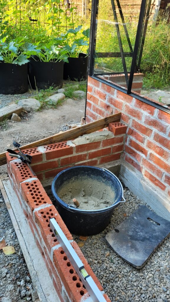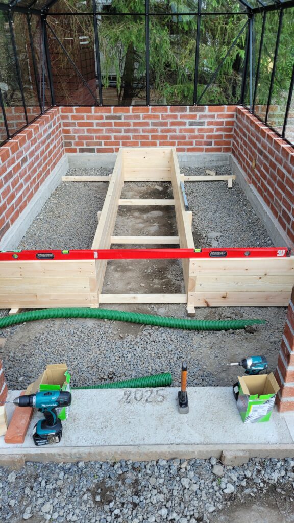 Nízká výška podezdívky skleníku limitovala zídku pařníku, která by byla nedostatečná prakticky pro jakékoliv pěstování, a tak jsme vnitřek oproti terénu zapustili.