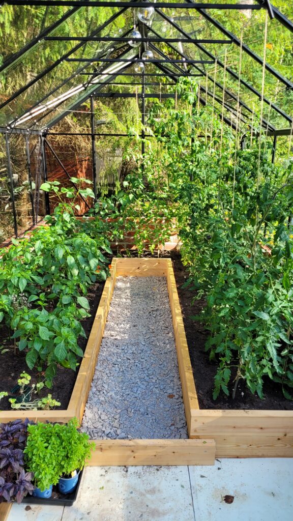 Úroda byla letos mizerná. Od brzkého jara jsme bojovali s mšicemi, a po vysazení rostlin ven, i s housenkami. Po dokončení skleníku navíc přišlo několik týdnů třicetistupňových veder, takže se růst všeho úplně zastavil. Rajčata v novém skleníku tak nestihla uzrát, papriky jsme nějaké sklidili. Tak snad to příští rok bude lepší… Jinak máme, až na těch pár pěstování neomezujících detailů, hotovo.