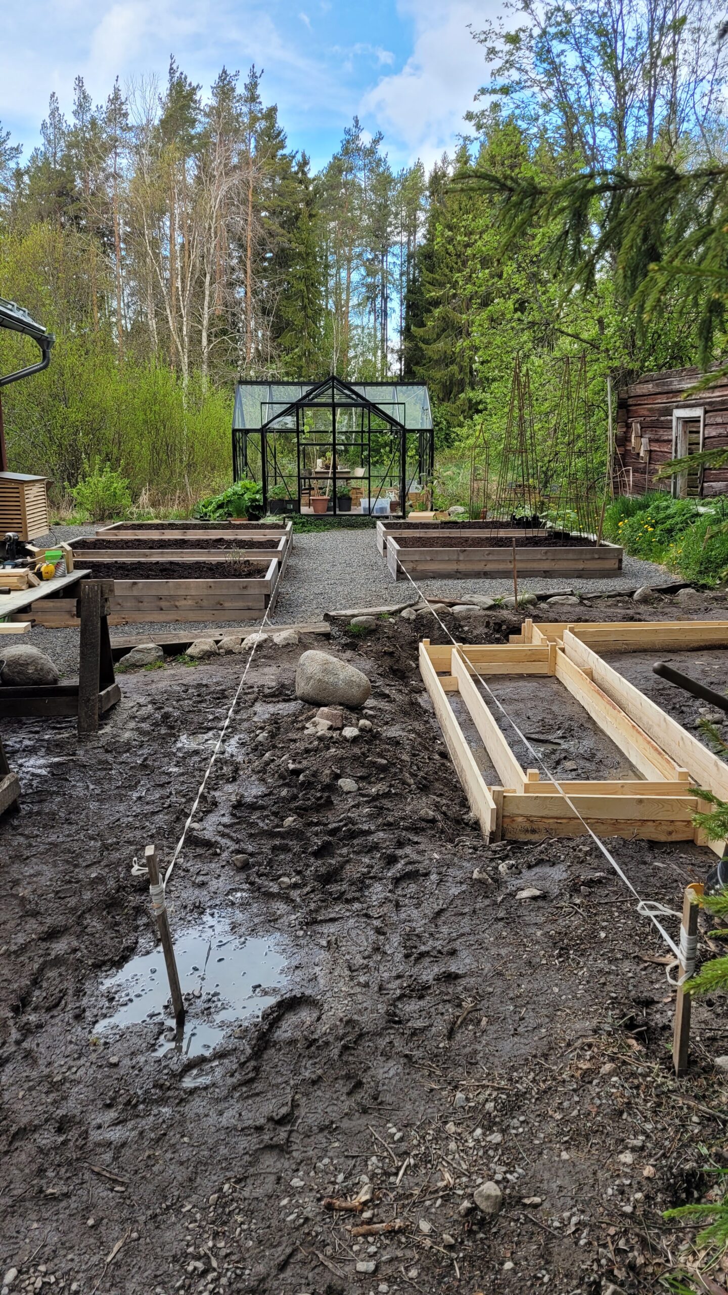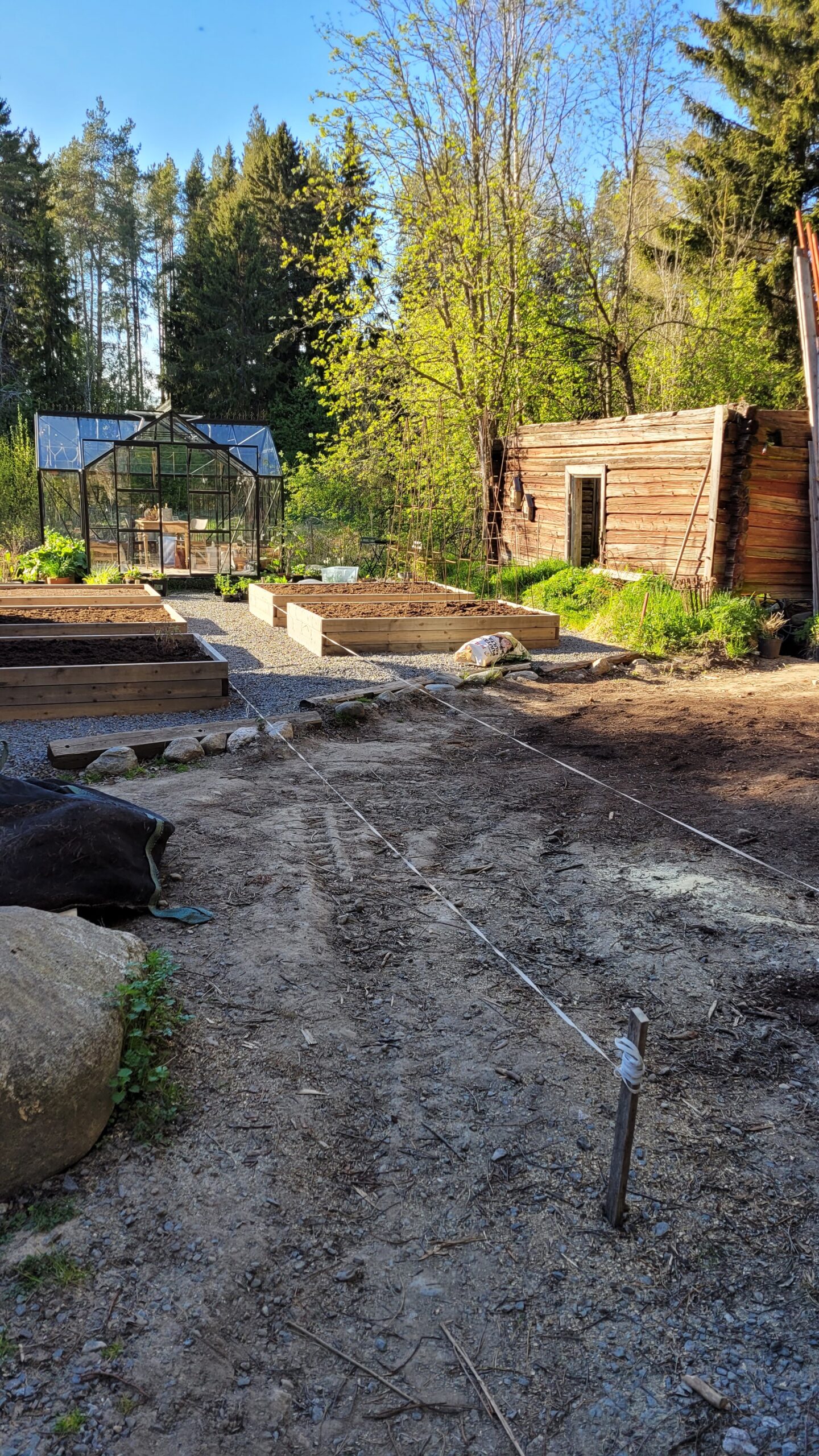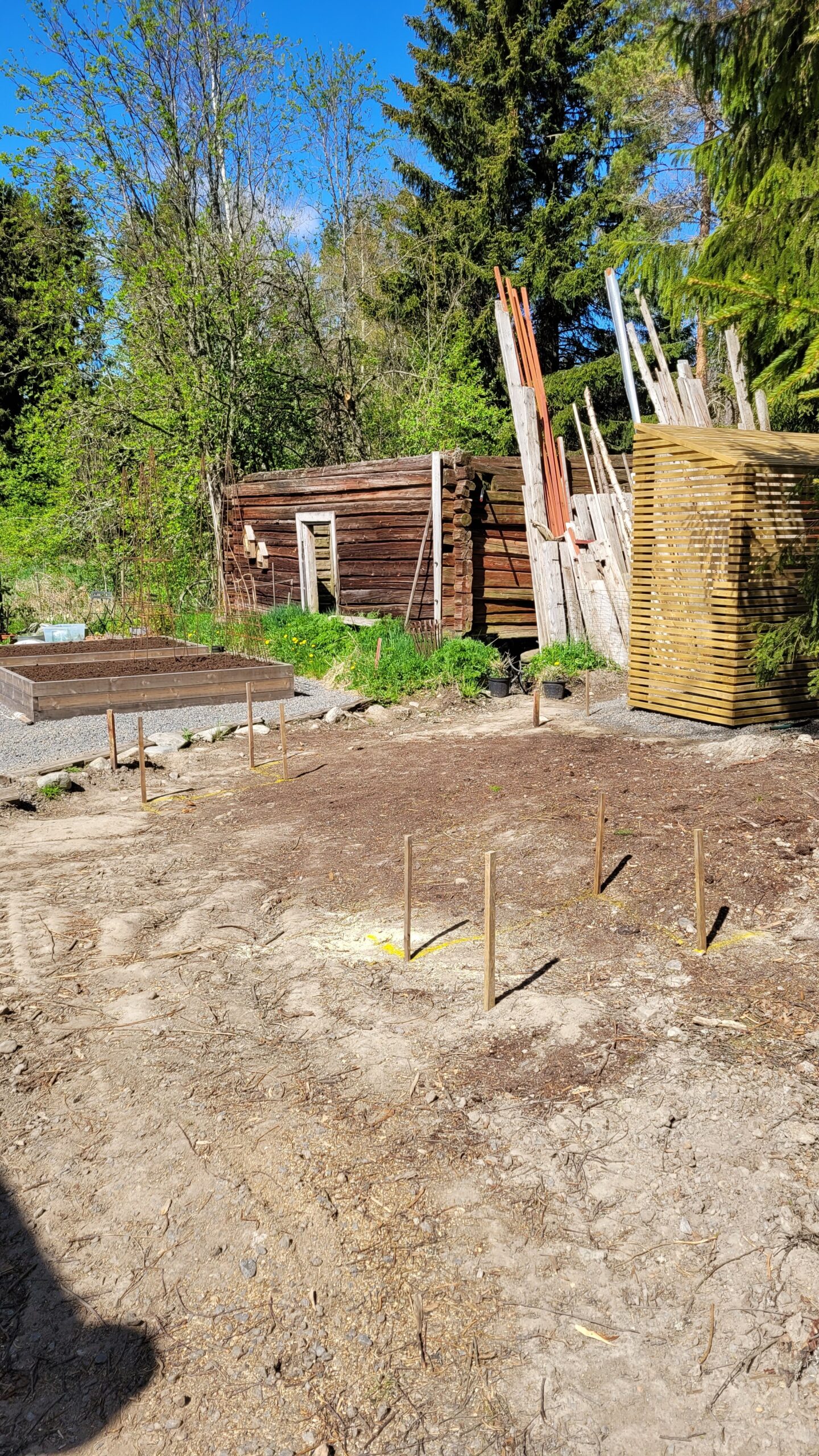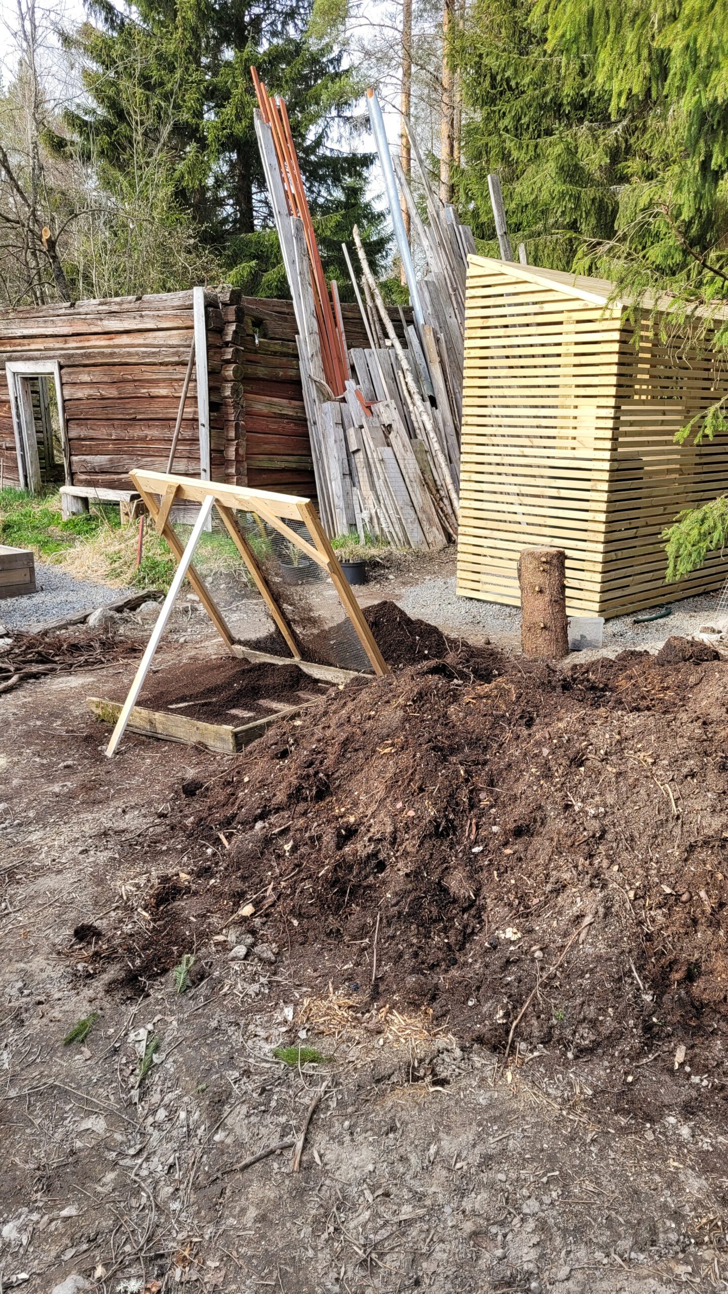 Na místě skleníku se nacházel původní kompost, který bylo možné odstranit až pozdě na jaře, protože byl na kámen zmrzlý. Po jeho romrznutí jsme nedostatečně zkompostovanou část přesunuli do nového kompostu, a zkompostovanou část překátrovali k použití v záhonech.