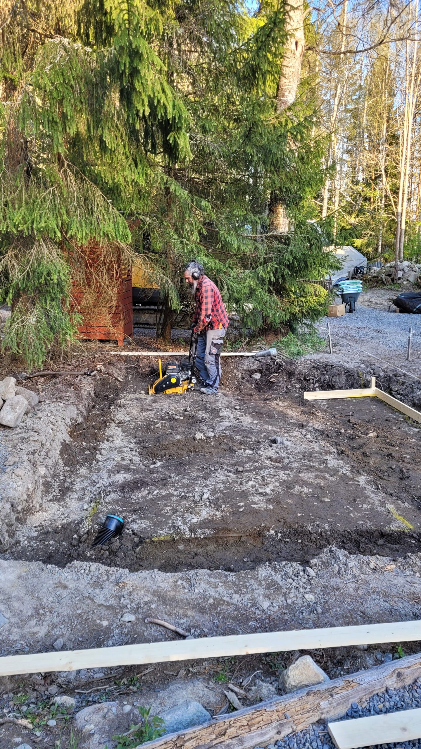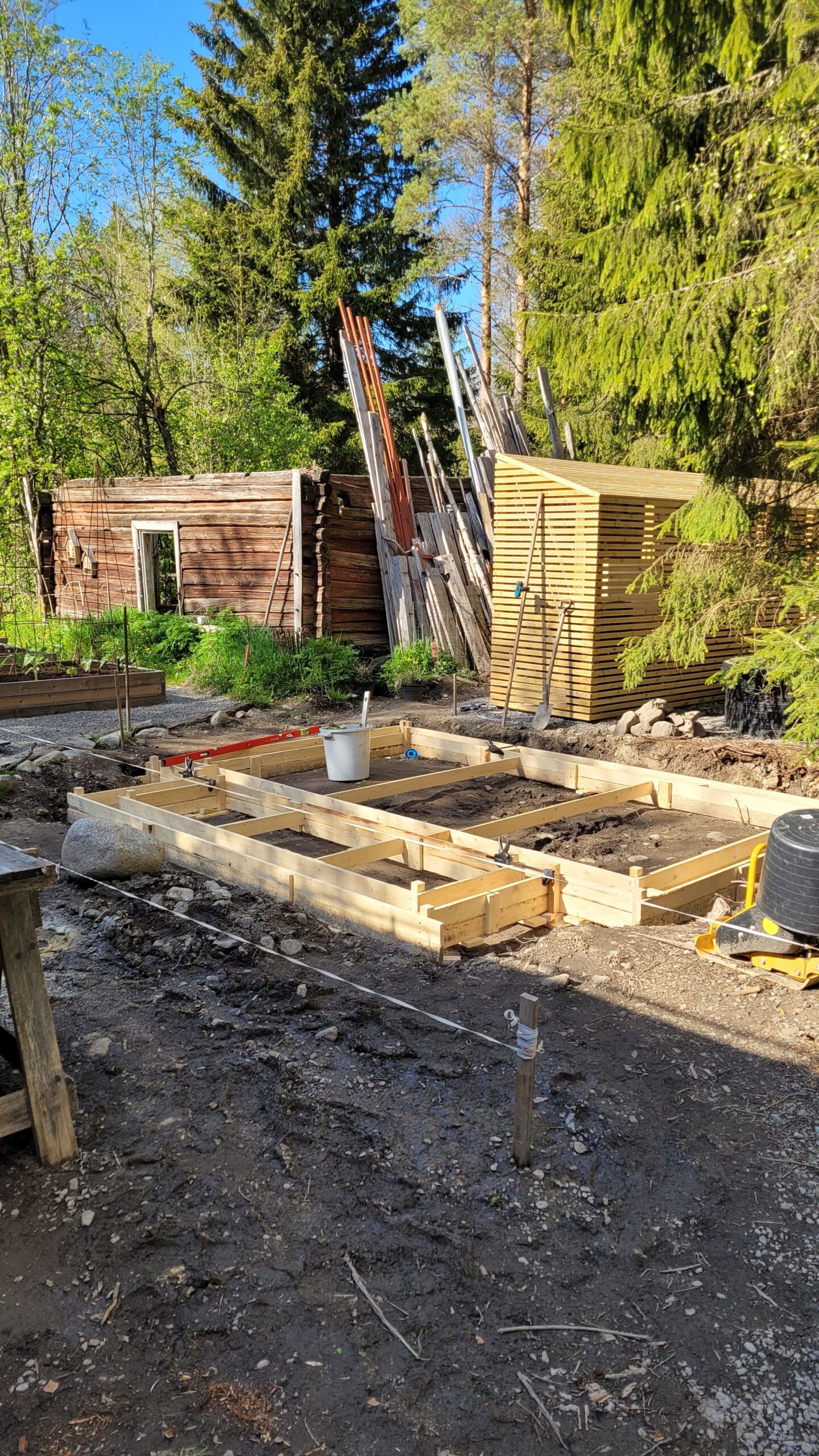 Pak přišlo na řadu vyměřování, bagrování a beton….. a ano, zase kameny.. Přesné umístění skleníku je tak dáno mimo jiné prostorem mezi kořeny stromů a nevykopatelnými kameny. A jak už to tak bývá… kdykoliv cokoliv kopeme, zaprší…