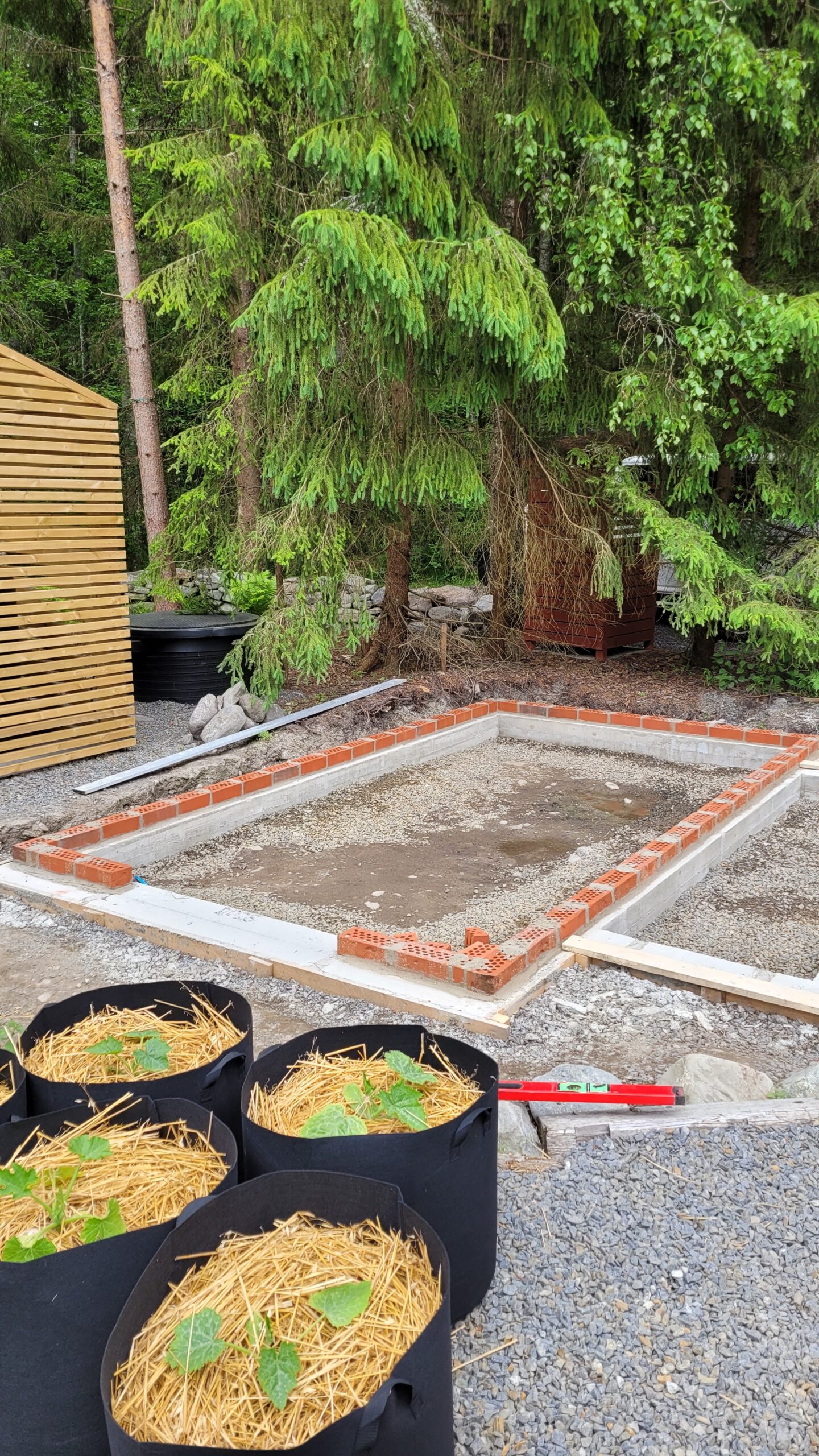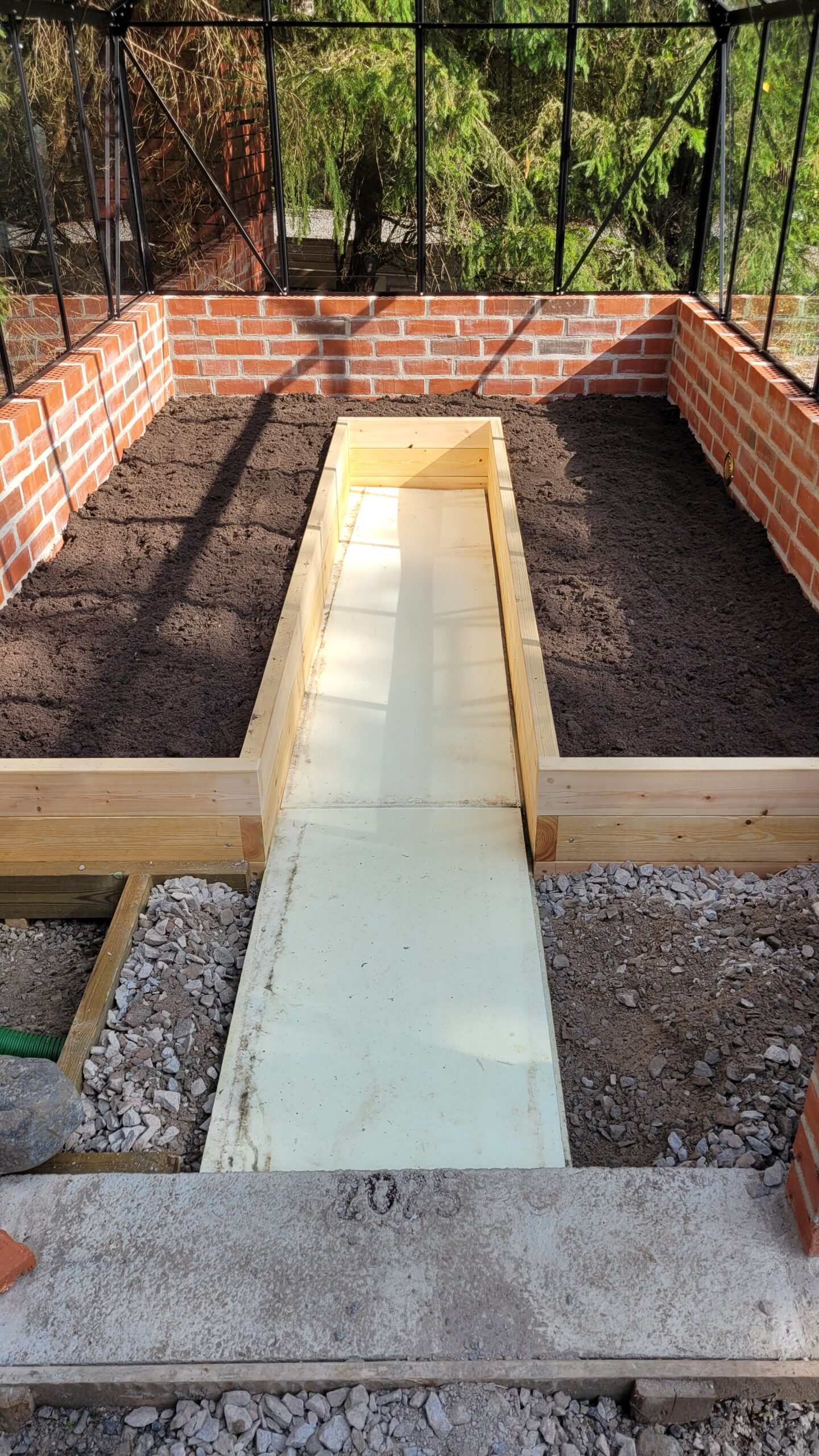 Nízká výška podezdívky skleníku limitovala zídku pařníku, která by byla nedostatečná prakticky pro jakékoliv pěstování, a tak jsme vnitřek oproti terénu zapustili.