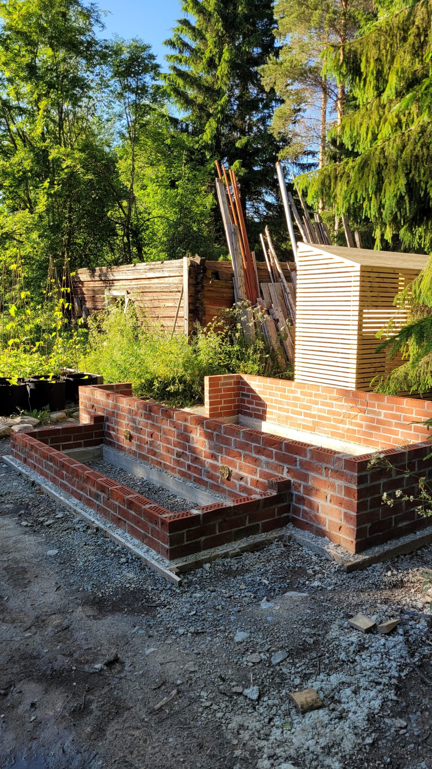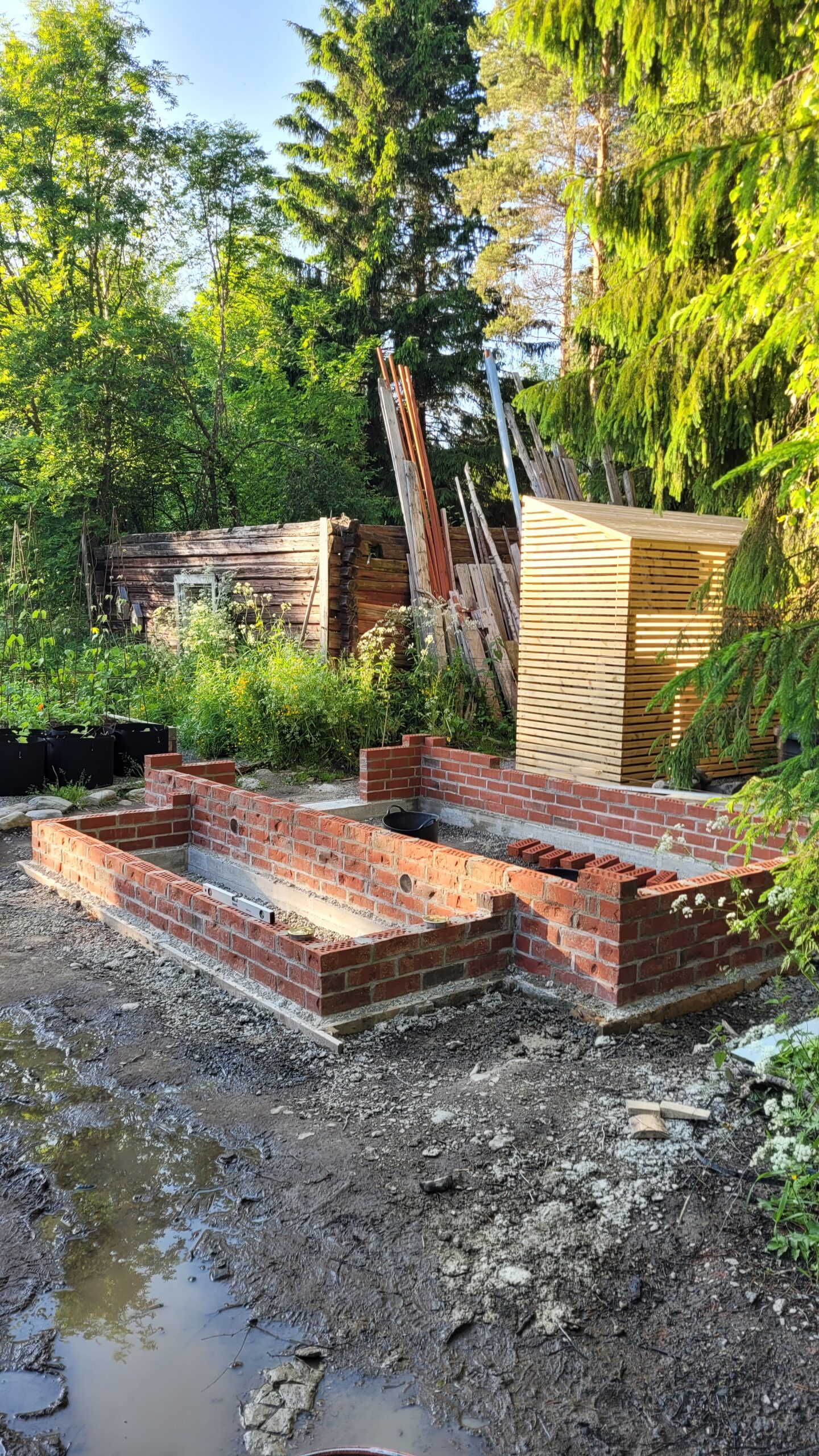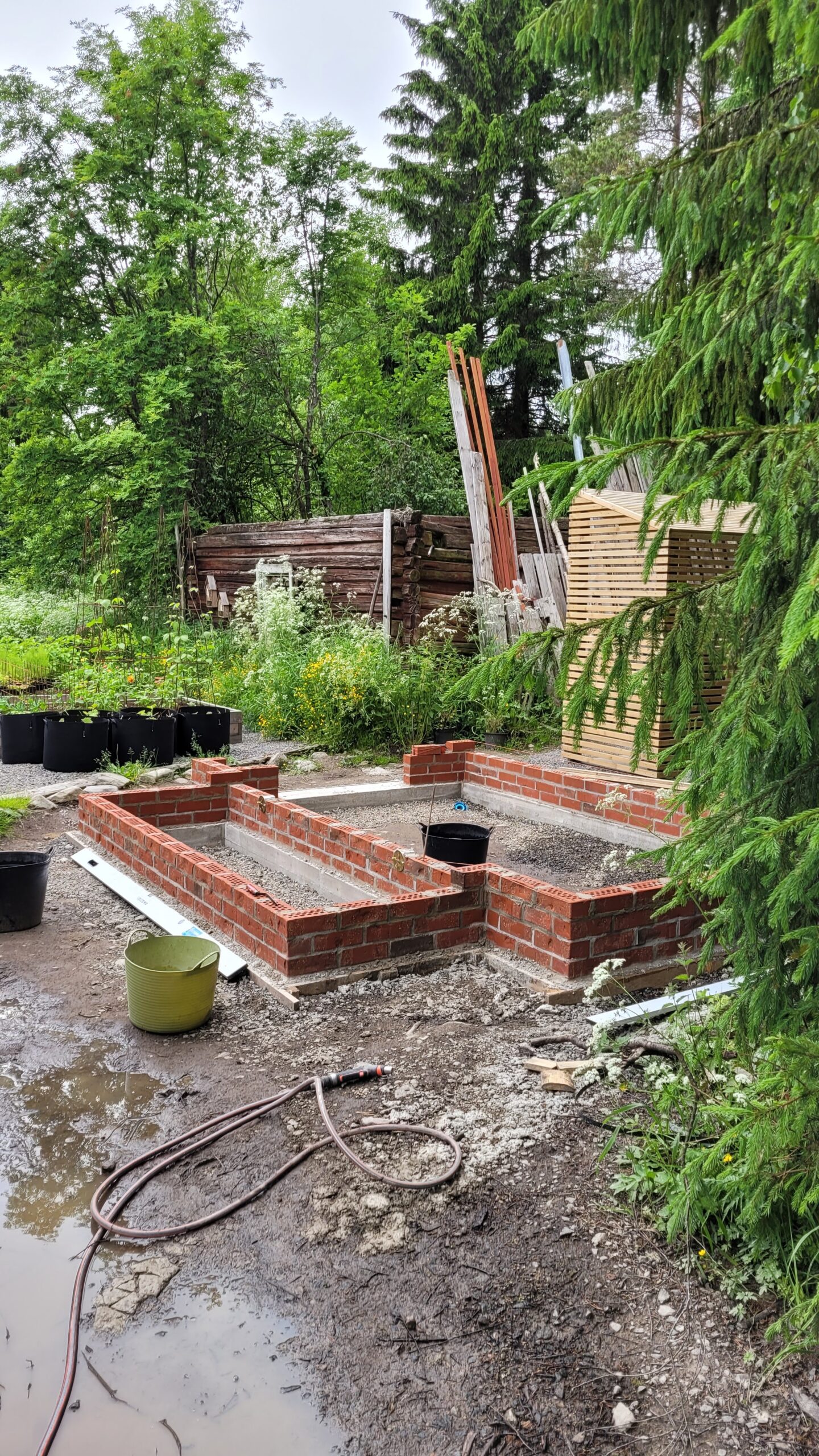 Dlážděná část podlahy bude vytápěná a v prostoru vedle dveří bude přivedená voda. Nic z toho jsme ale zatím dokončit nestihli, stejně jako víka na pařník. Zvládli jsme však přidat ještě poslední chybějící záhon.