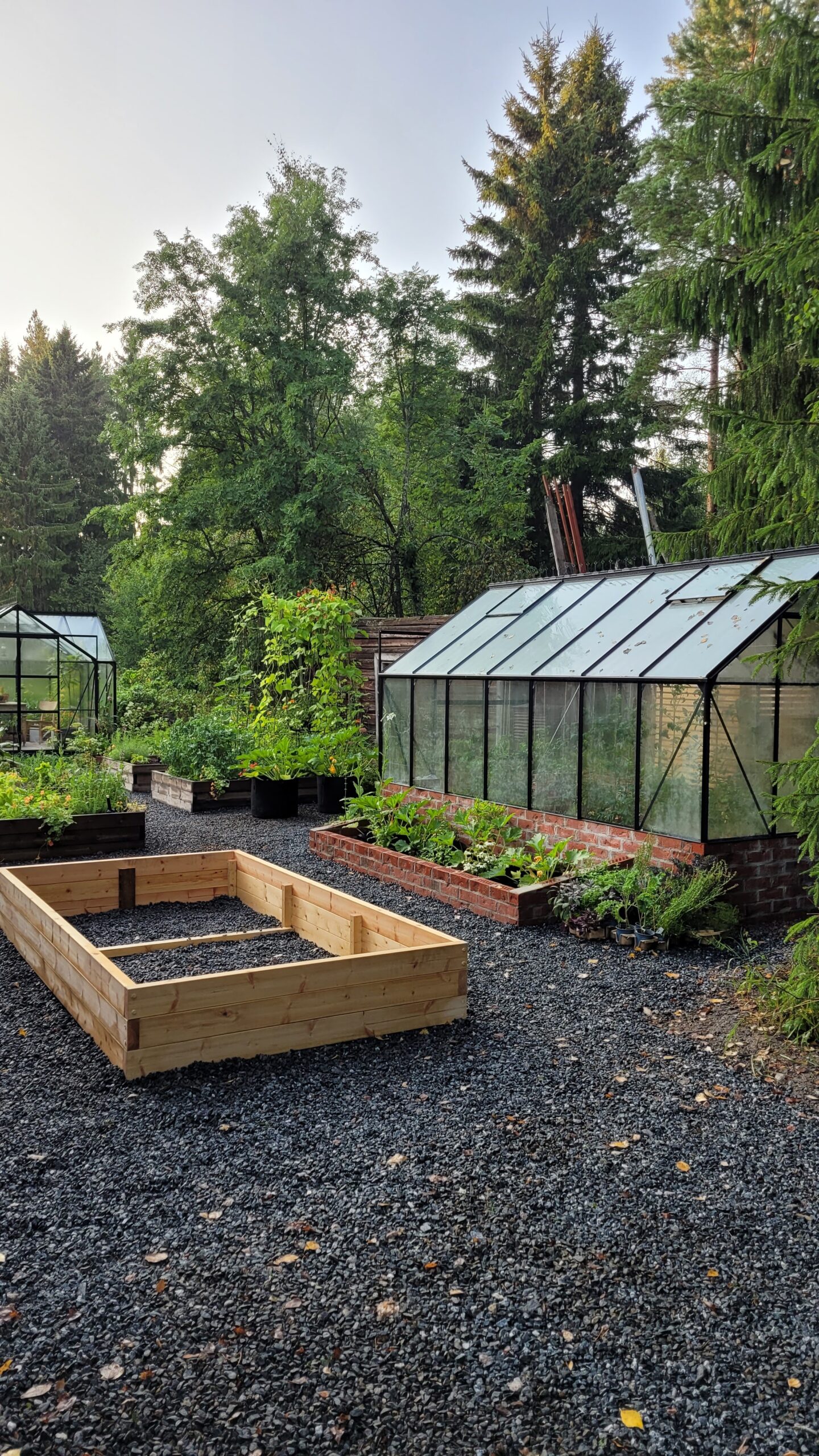 Totiž pařeniště…. postavili jsme si něco, čemu v Británii říkají „cold frame“. Nebude v něm hlína, jen štěrk, a bude sloužit pro rostliny v nádobách. Na jaře pro předpěstovávané rostliny, které už mohou být venku, ale potřebují být chráněné, v létě např. na cukety.
