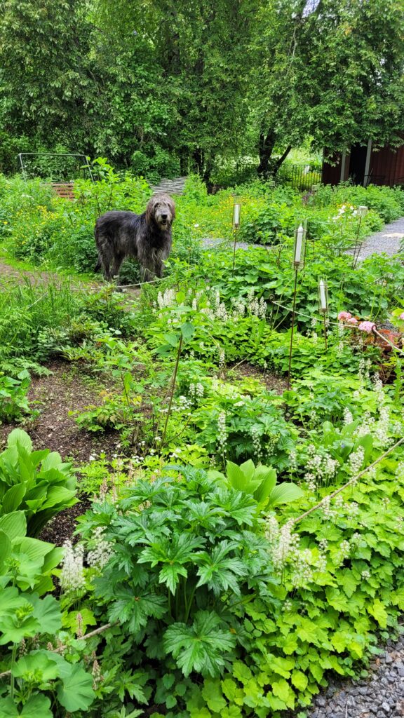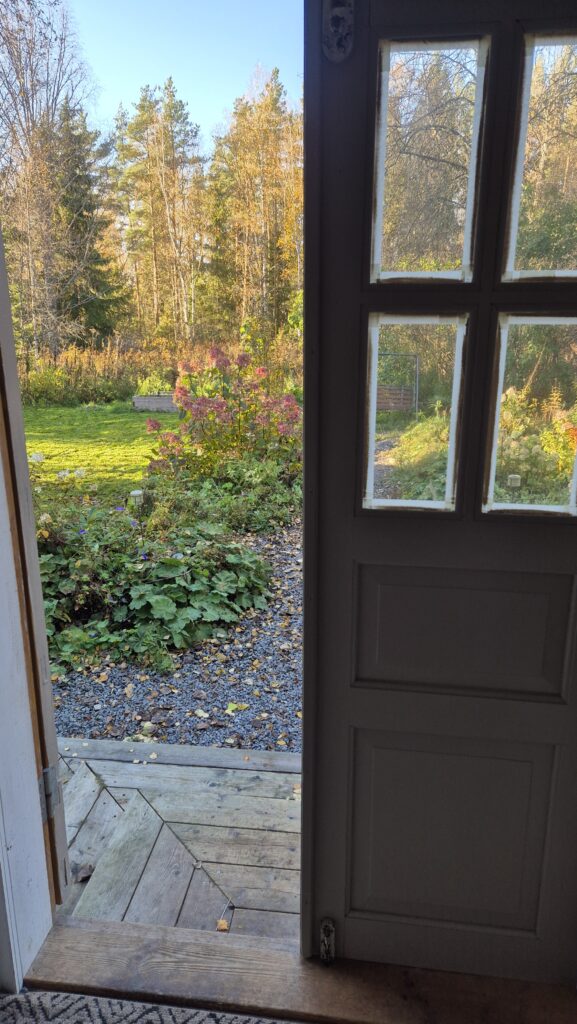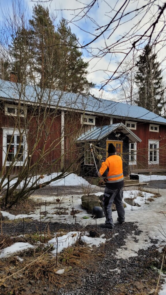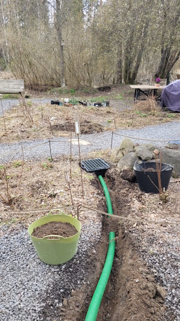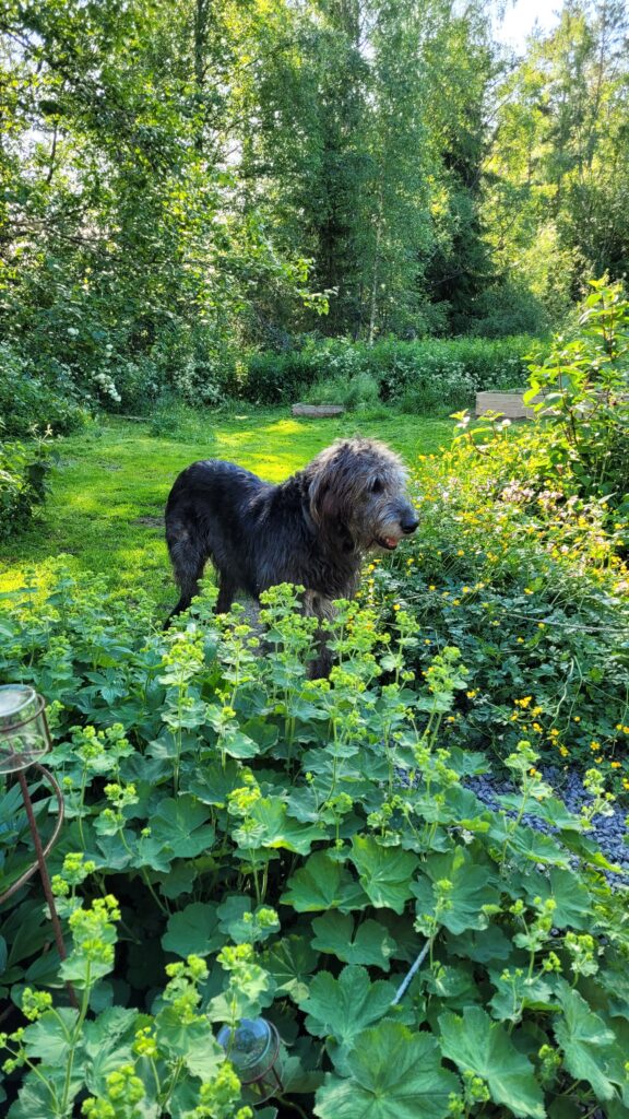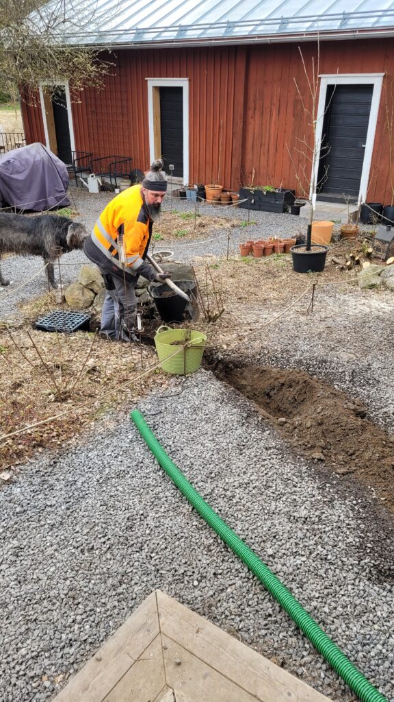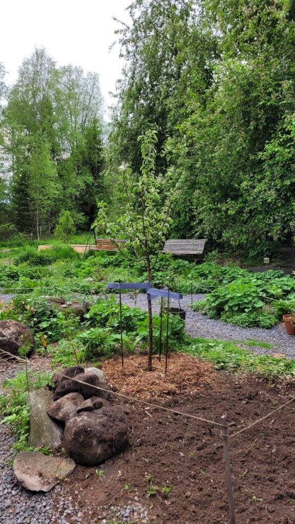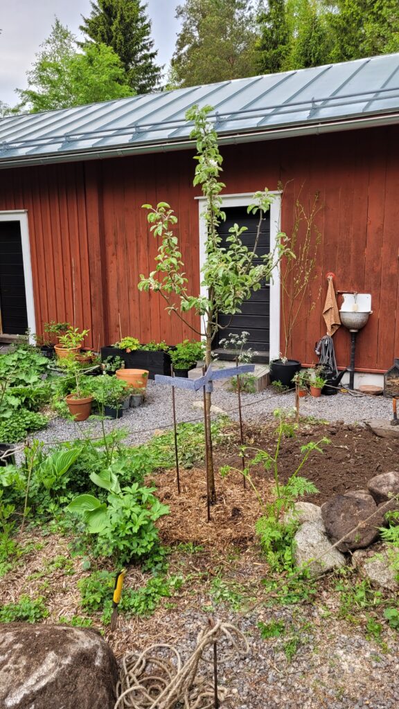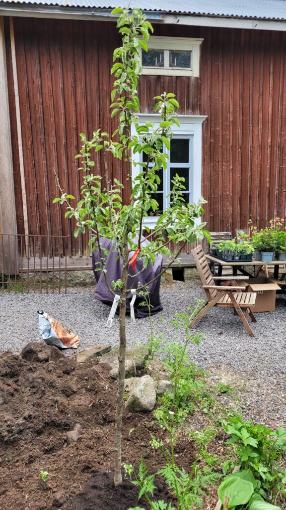 Podařilo se nám sehnat už trochu větší plodící strom (finská odrůda Valkeakuulas), tak snad přežije první zimu. Na práce samozřejmě dohlížel Alvar… kterého jsme nakonec pro jeho vlastní dobro museli zavřít do verandy…