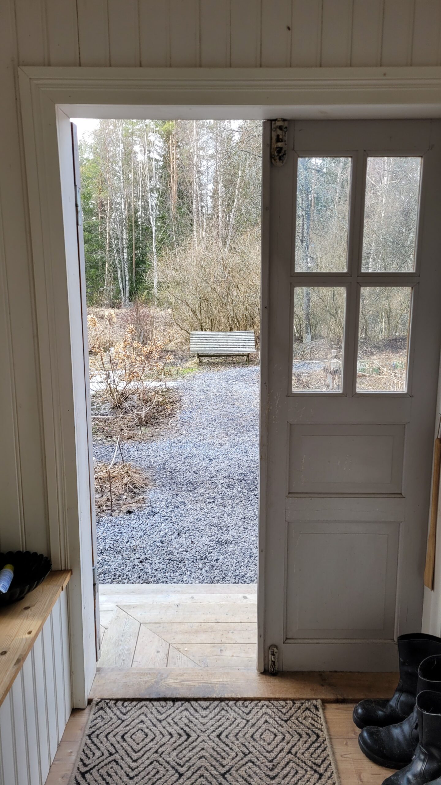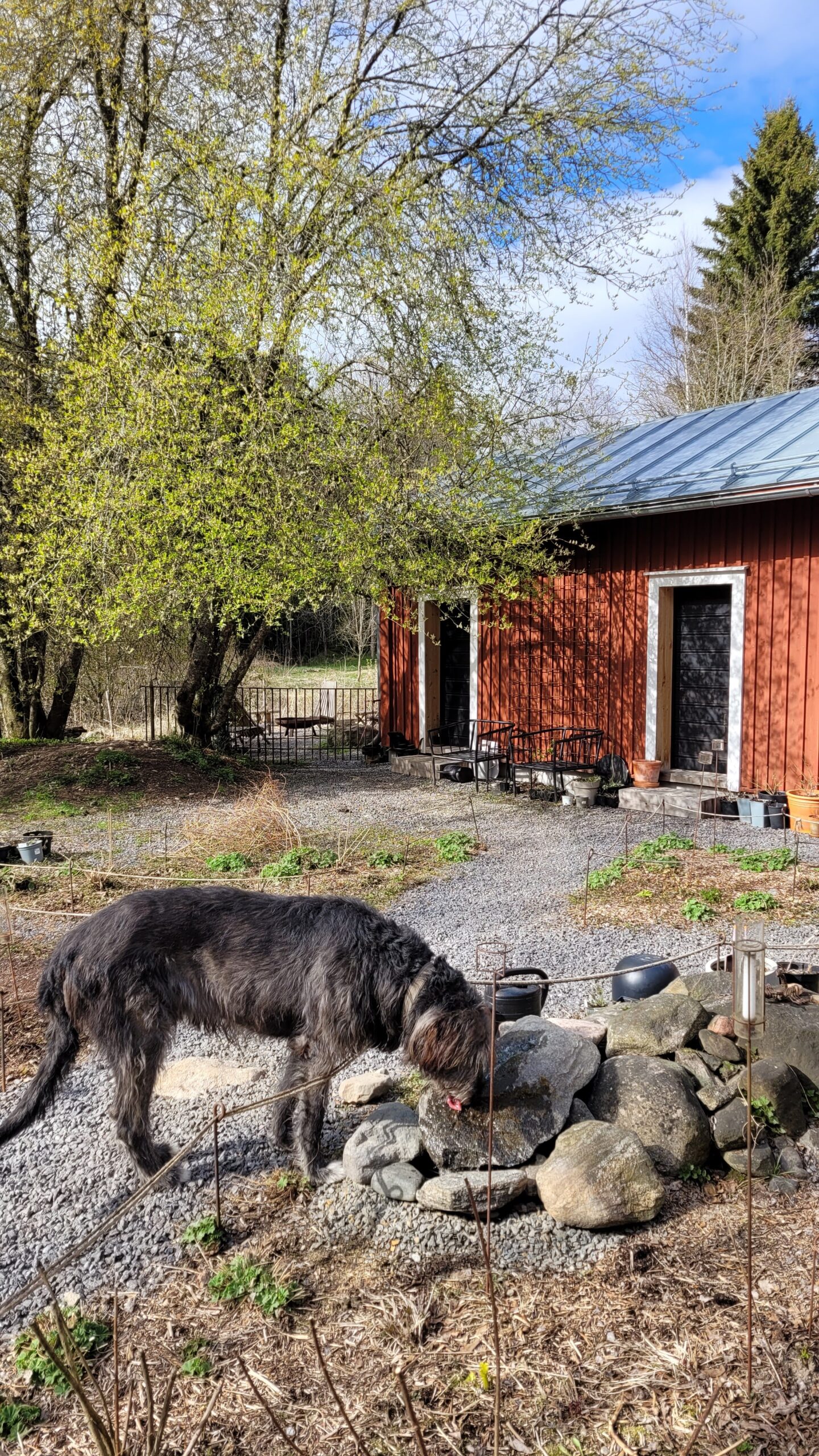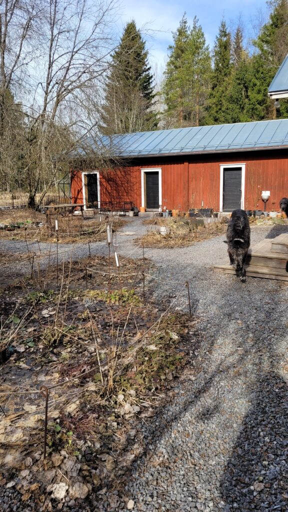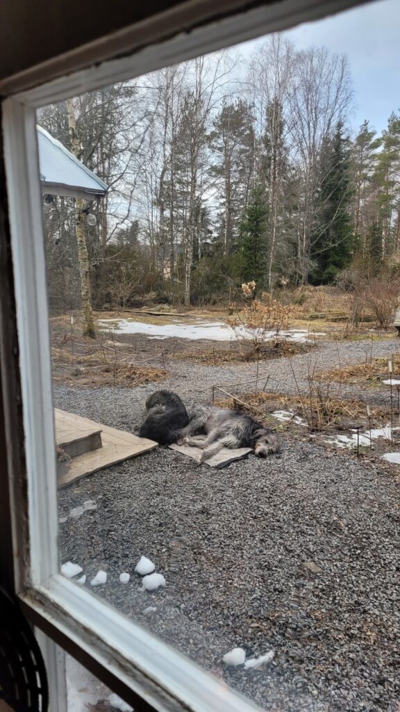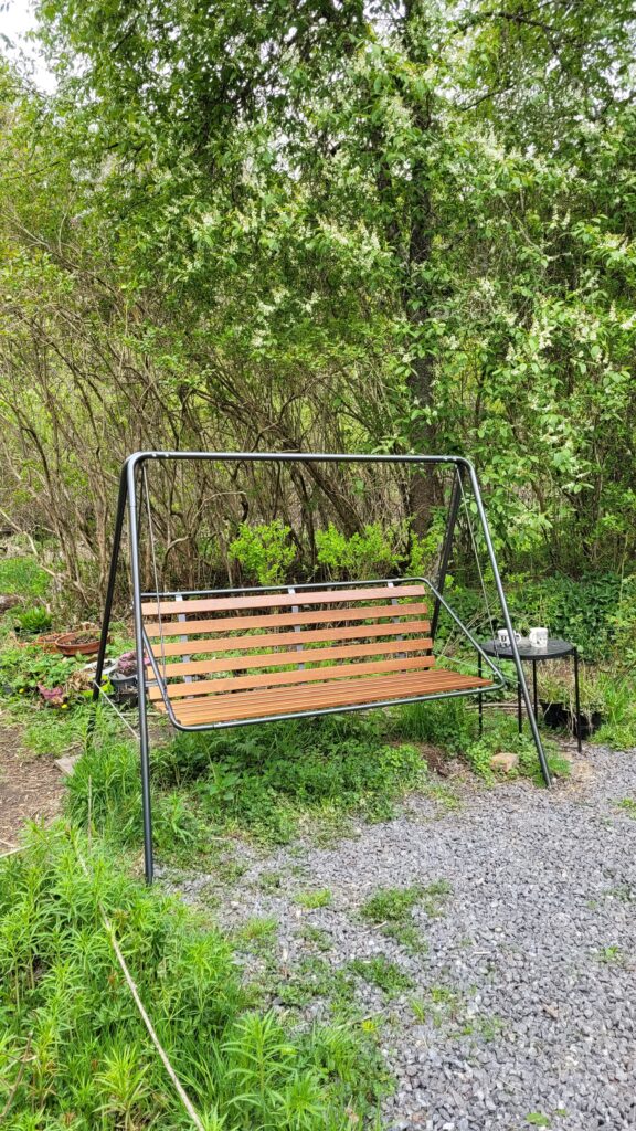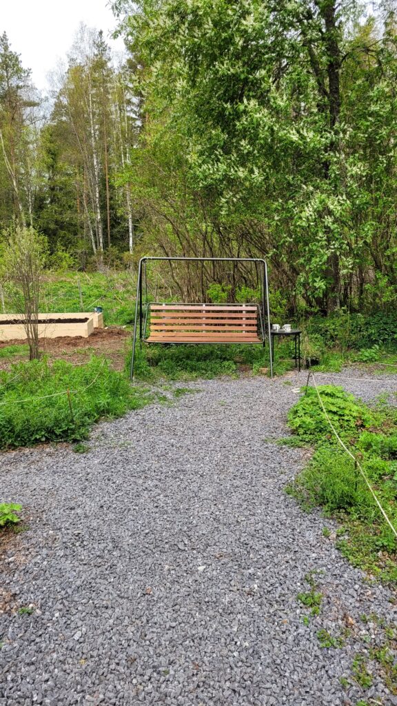 Pověsili jsme pár nových ptačích budek, začali připravovat terén pod skleník, a také jsem si po letech toužení pořídila houpací lavici – retro model finské firmy Varax. Dlouho jsem odolávala, protože lavici na sezení na dvoře jsme měli. Ta byla ve špatném stavu, a Pepa ji před pár lety poopravil, nicméně nám ji následně okousala štěňata, a ulomilo se pár dalších špruslí. Pořád půjde opravit, ale už to není projekt na pár hodin + nátěr, ale bude potřeba ji nejspíš celou rozebrat…. s naší morálkou projekt na několik let, no.