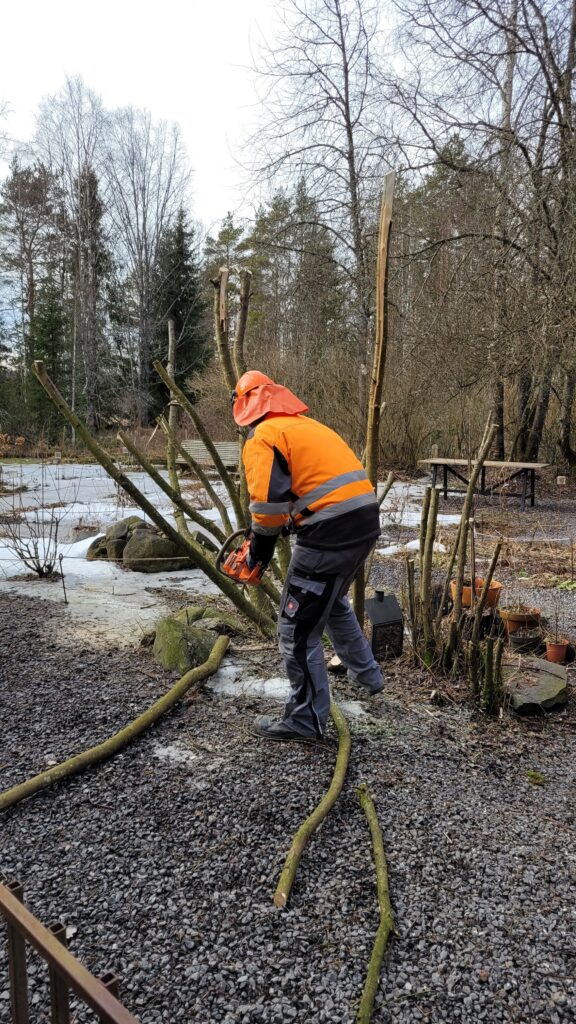 Po letech váhání jsme se odhodlali k likvidaci vrby na dvoře. Nechtěli jsme prostor úplně otevřít, a snažili se vrbu postupně prořezávat aby měla šanci obrašit, nic ale nepomohlo, a vrba se už několik let, přestože svázaná lanem, celá rozvalovala. V zimě pod sněhem, v létě po dešti. I přes ořez byla neustále v cestě. První léto po koupi domu původními majiteli pokácené nálety vyhodily asi půlmetrové výhony. Většinu pozemku jsme začali sekat, ale tenhle jeden keřík jsme nechali růst. Pár let trvalo, než z ní byl velký keř, pak asi dva tři roky byla hezká, a od té doby se rok co rok válela, a často byla pod útokem mšic a jiných breber.