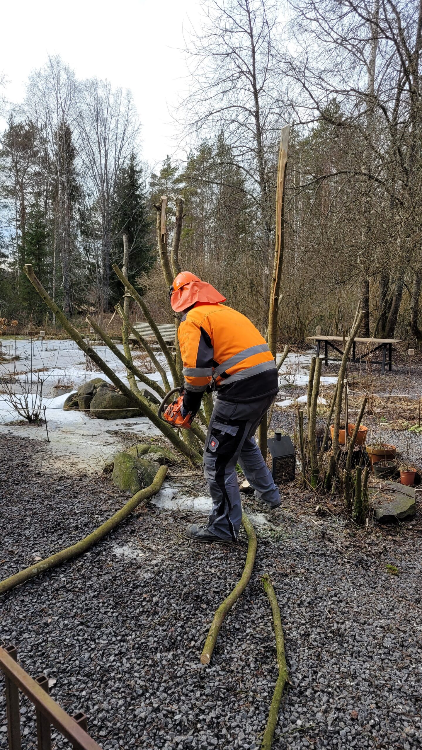 Variantou bylo uříznout ji celou a nechat znovu obrašit. Ale čekat roky až vyroste, aby pak byla hezká zase jen tři roky, nám přišlo jako nesmysl, a tak jsme po dlouhém váhání vrbu ořezali, a později, po komletním rozmrznutí země, vykopali kořeny a na místo zasadili jabloň.