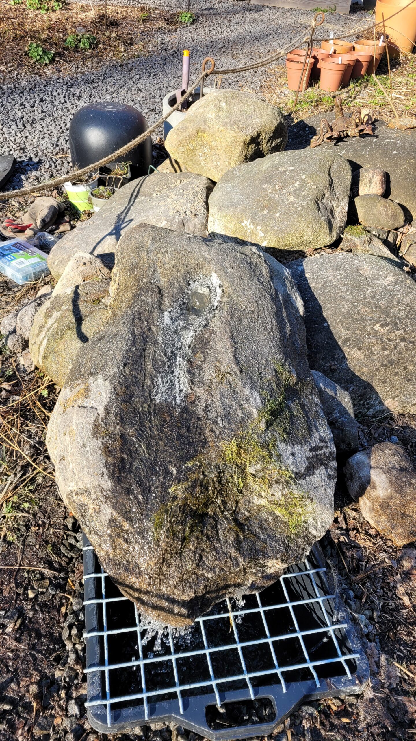 Dlouho jsme si do zahrady plánovali nějaký vodní prvek. Miniaturní jezírka se nám nelíbí, na velké nemáme prostor, a okrasné nádrže apod. bývají nebezpečné pro zvířata. Jelikož nám šlo hlavně o zvuk tekoucí vody, pořídili jsme nakonec menší nádrž s fontánkou, kterou jsme umístili do kamene k už již existující hromadě v trvalkovém záhoně. Když vše zaroste, není na fontánku od venkovního sezení vidět, ale to nevadí, protože primárně jsem chtěla vodu pro ptáky.